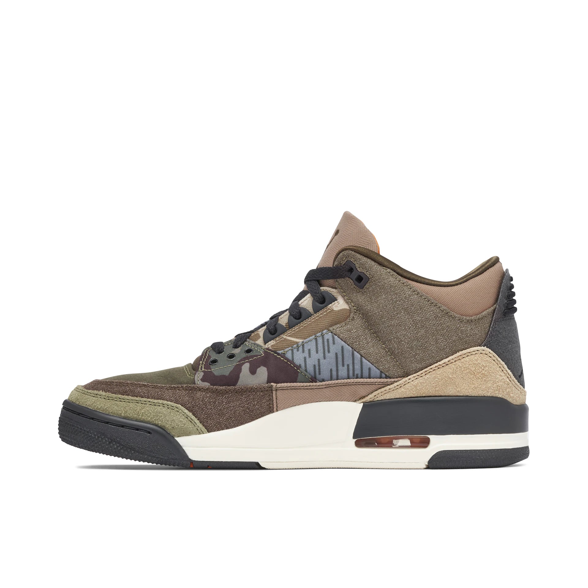 Taking inspiration from vintage surplus stores and fabrics, the Air Jordan 3 features a mixed camo patchwork upper consisting of waxed canvas, ripstop nylon, herringbone, wool, and twill materials. Adding more customization opportunities, heel tabs are backed with Velcro material so that you can interchange Nike Air and Jumpman logo patches.