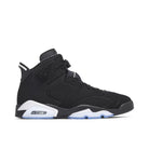 The Air Jordan 6 Retro Chrome is crafted from a tumbled leather, synthetic nubuck and synthetic textiles, with a color palette of black and metallic silver. This Retro Air Jordan 6 comes in a black/metallic silver-chrome colorway. The sneaker has a mid-top mounted on a black polyurethane midsole, highlighted with metallic silver accents and supported by a translucent rubber outsole.