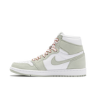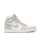 The women's Air Jordan 1 High Seafoam (W) arrives in a smooth white leather construction with Seafoam Durabuck overlays and Swooshes. On the laces, crisp bronze trimming stands out against the design's subtle coloration. The women's Air Jordan 1 High Seafoam (W)