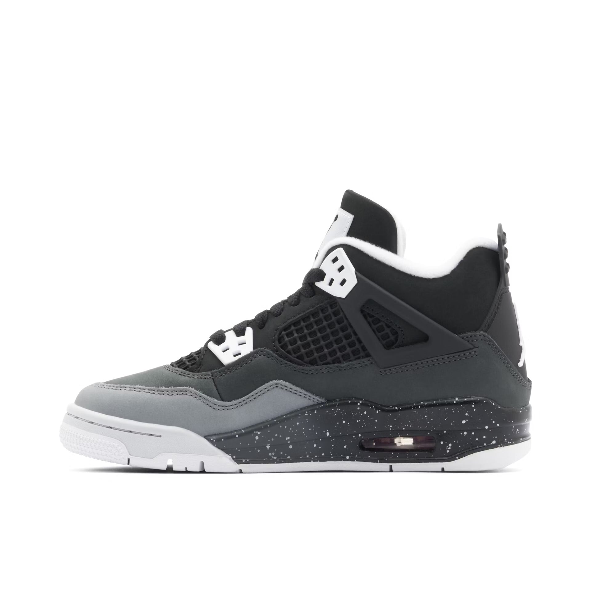 The Jordan 4 Retro Fear 2024 (GS) relaunches the recognizable silhouette from 2013, this time in a grade school size. It boasts a grayscale colorway with white, black, Anthracite, and Pure Platinum hues.