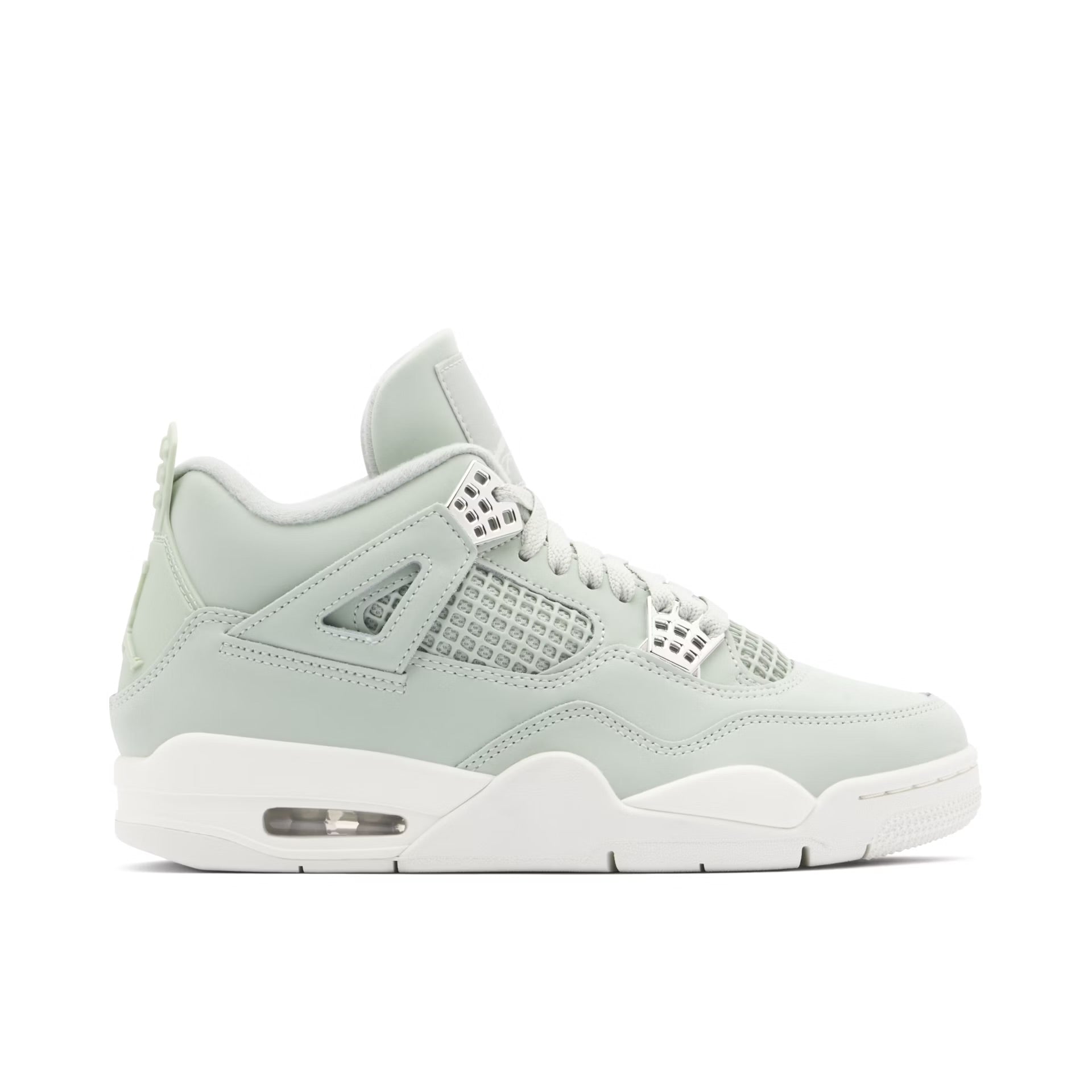 This high-top Jordan 4 is a retro model and women’s sized sneaker. Dressed in a seafoam, minty green tone, this shoe has a luxurious and elegant aesthetic. The premium nubuck upper adds a velvety touch and while the signature mesh side panels provide breathability. You’ll spot metallic silver detailing in the form of an element that doubles as part of the eye stay. The Jumpman logo is on a patch on the tongue, while the back heel sports the rubberized logo along with the textured pull tab.