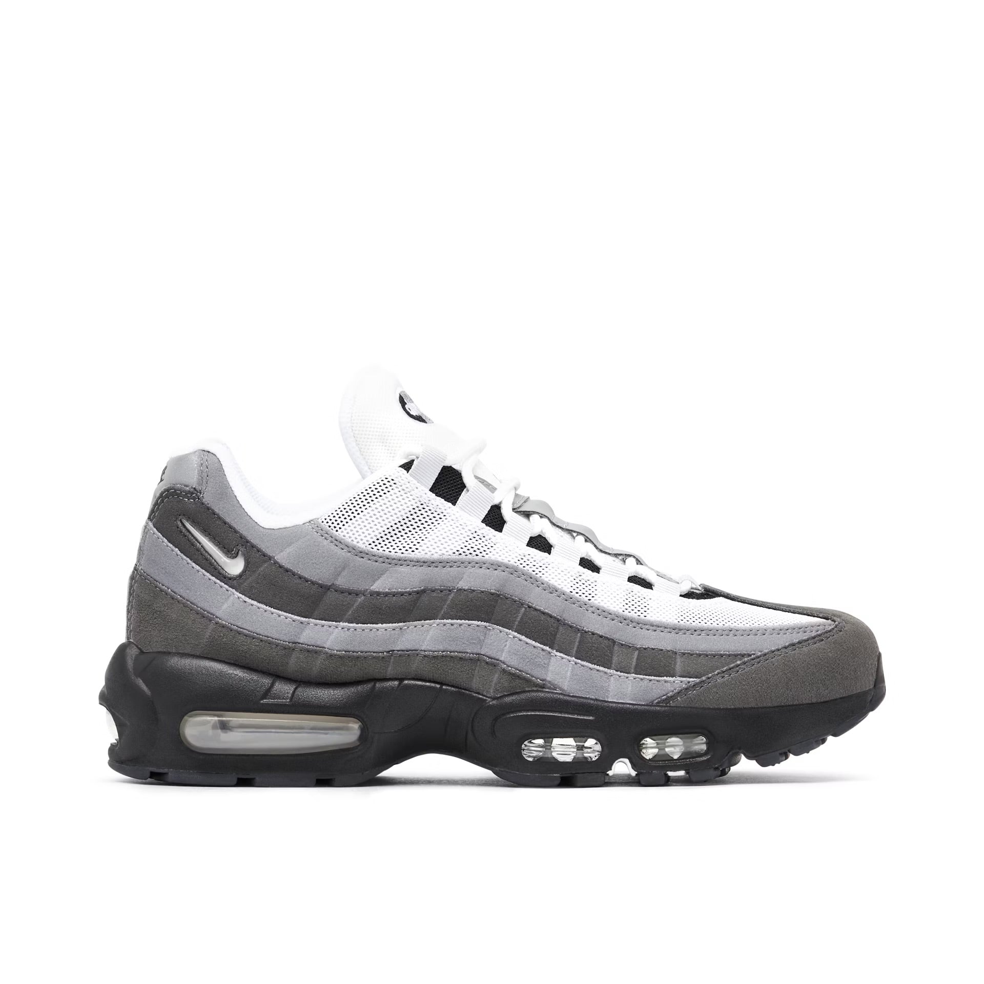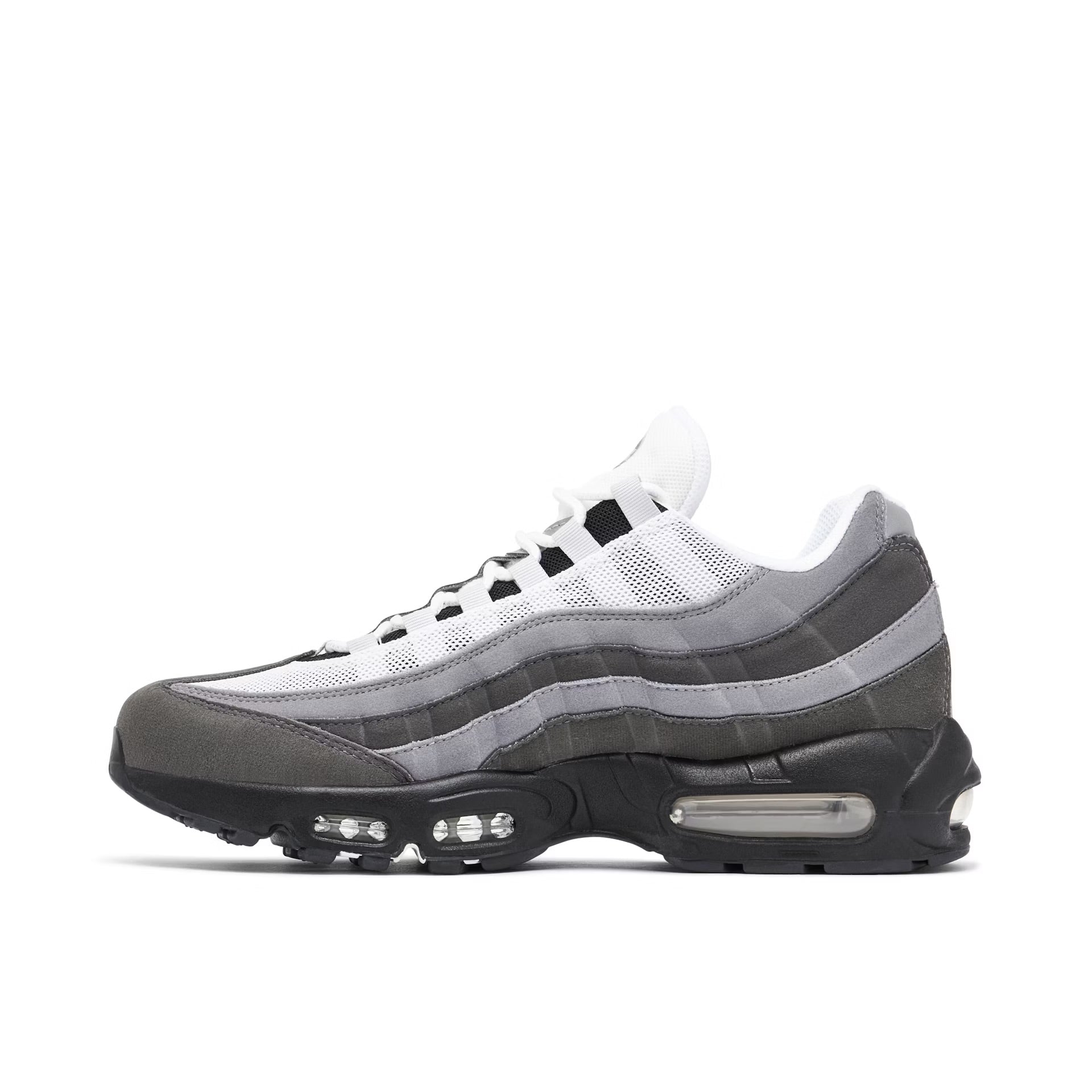 The iconic sole of this Air Max 95 features a dark grey rubber outsole and a shiny black with instances of a transparent Air Max unit on the forefoot and heel. The dark grey hue returns to the suede overlay covering the mudguard. For aeration, the upper is fully textile with a white netting base. On the quarter panels are several layers with alternating dark grey and grey suede finishes and the mesh underlay topping them off at the eye stay.